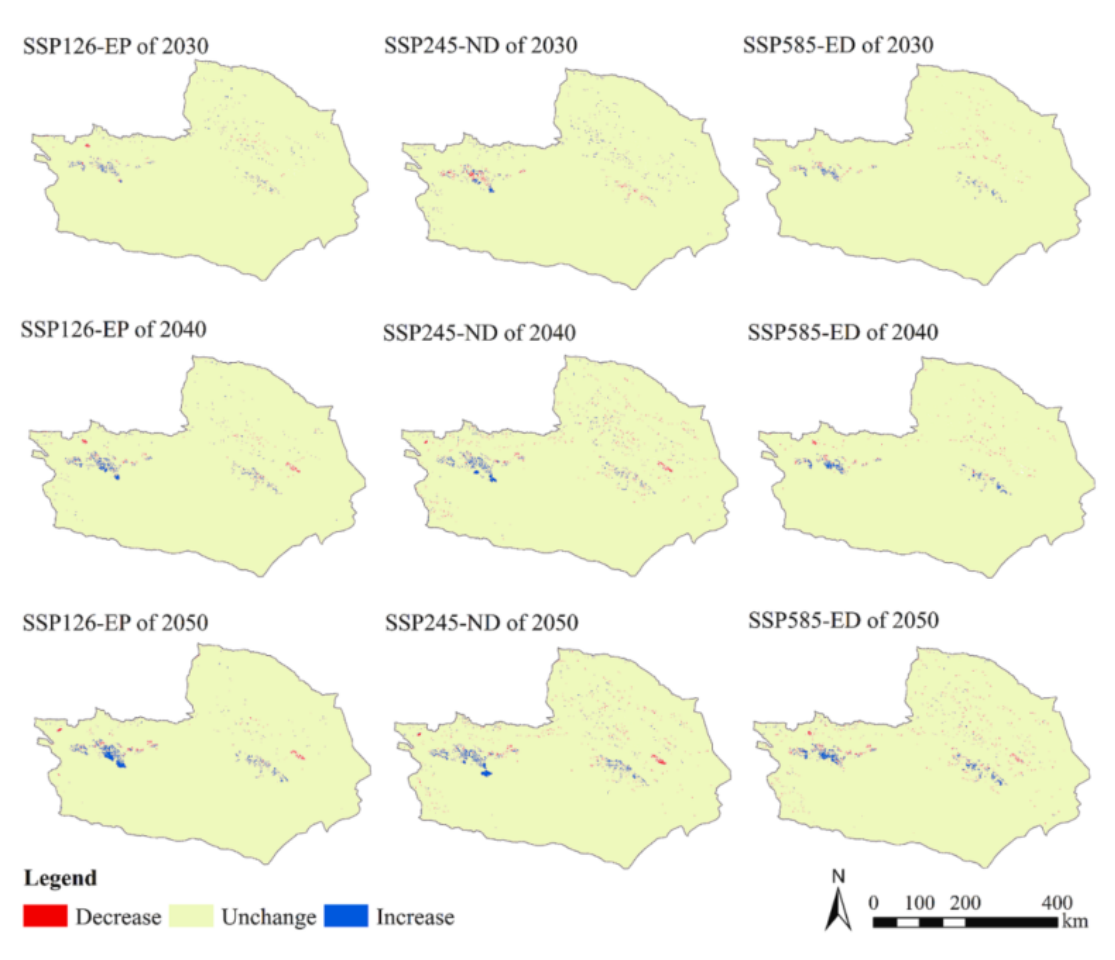 2. 动态模拟预测:通过利用三种典型的社会经济路径情景和三种发展情景,本研究旨在预测2030年至2050年的土地利用模式。