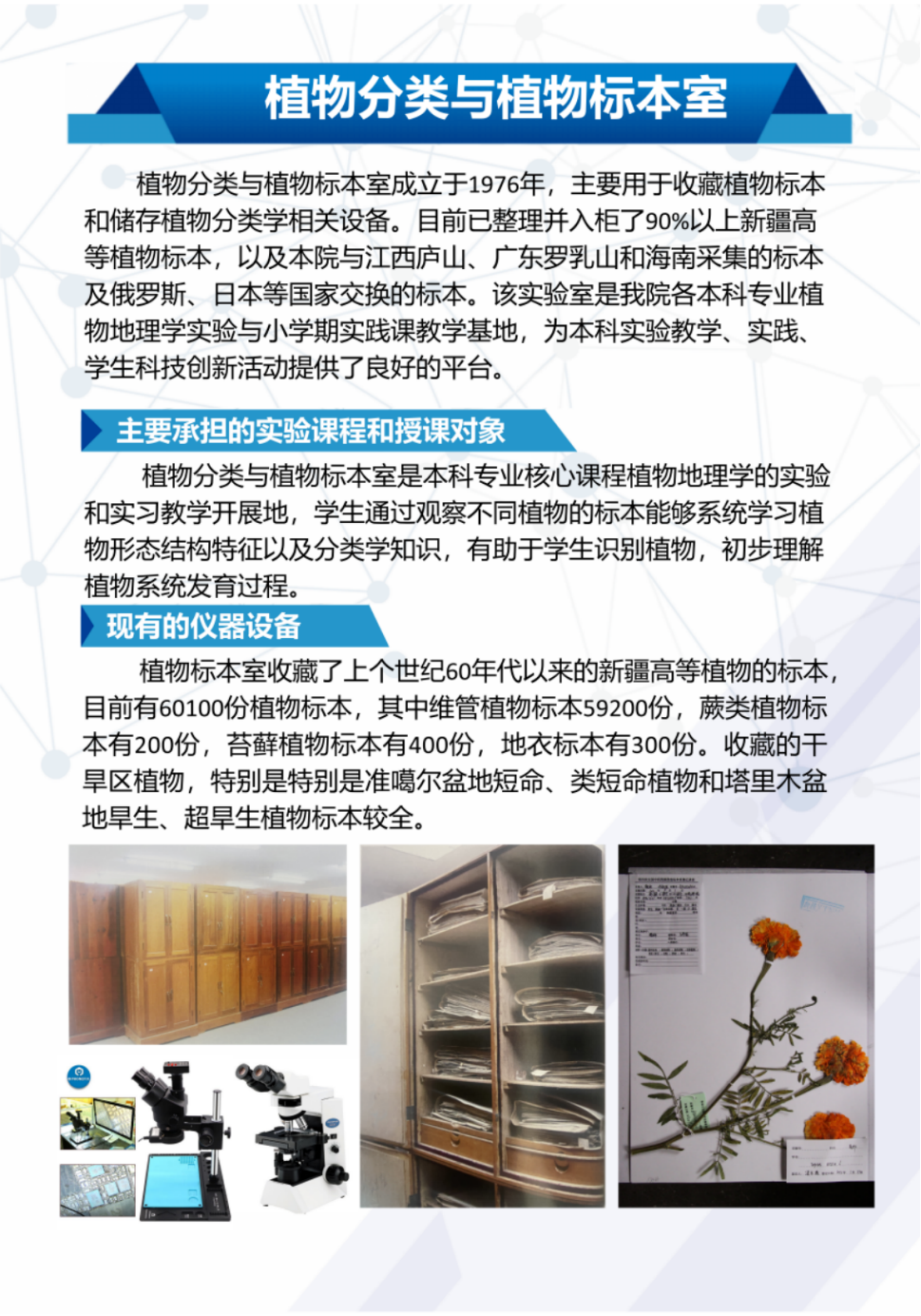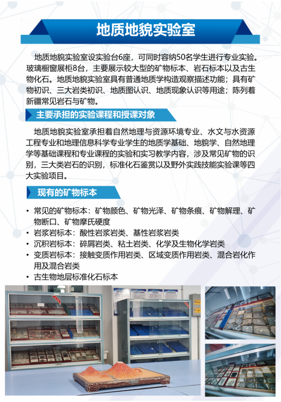 共5间实验室,总建筑面积777m2:425土壤化学实验室、427水土保持实验室、429植物分类与植物标本室、448城乡规划实验室、450气象与气候观测模拟实验室、452水文水资源实验室、454植物结构观察实验室、456地质地貌实验室。主要承担了所有本科专业《土壤地理学》、《气象学与气候学》、《植物地理学》、《城乡规划》、《地质地貌学》及《水文学》等专业课程实验、实习教学。