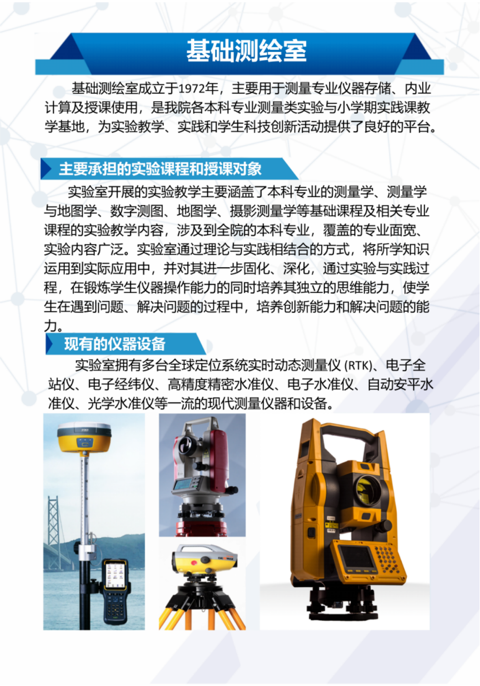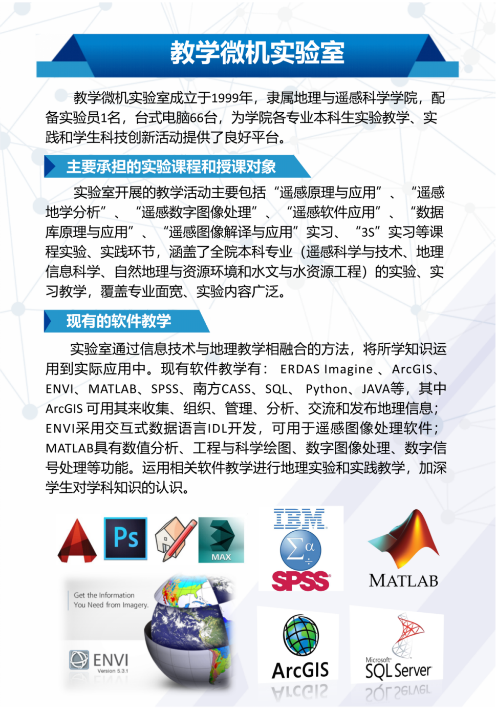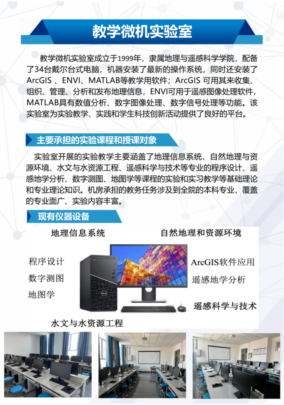 包括5间实验室,总建筑面积621m2:野外仪器室、124基础测绘仪器室 、141数字测量实验室、431小机房 、458大机房 。该实验室开展的实验教学主要涵盖了学院各本科专业的《基础测量学》、《数字地形测绘》、《地图学》、《摄影测量学》、《地理信息系统》、《遥感原理与应用》等地球信息技术类基础课和专业课课程实验。